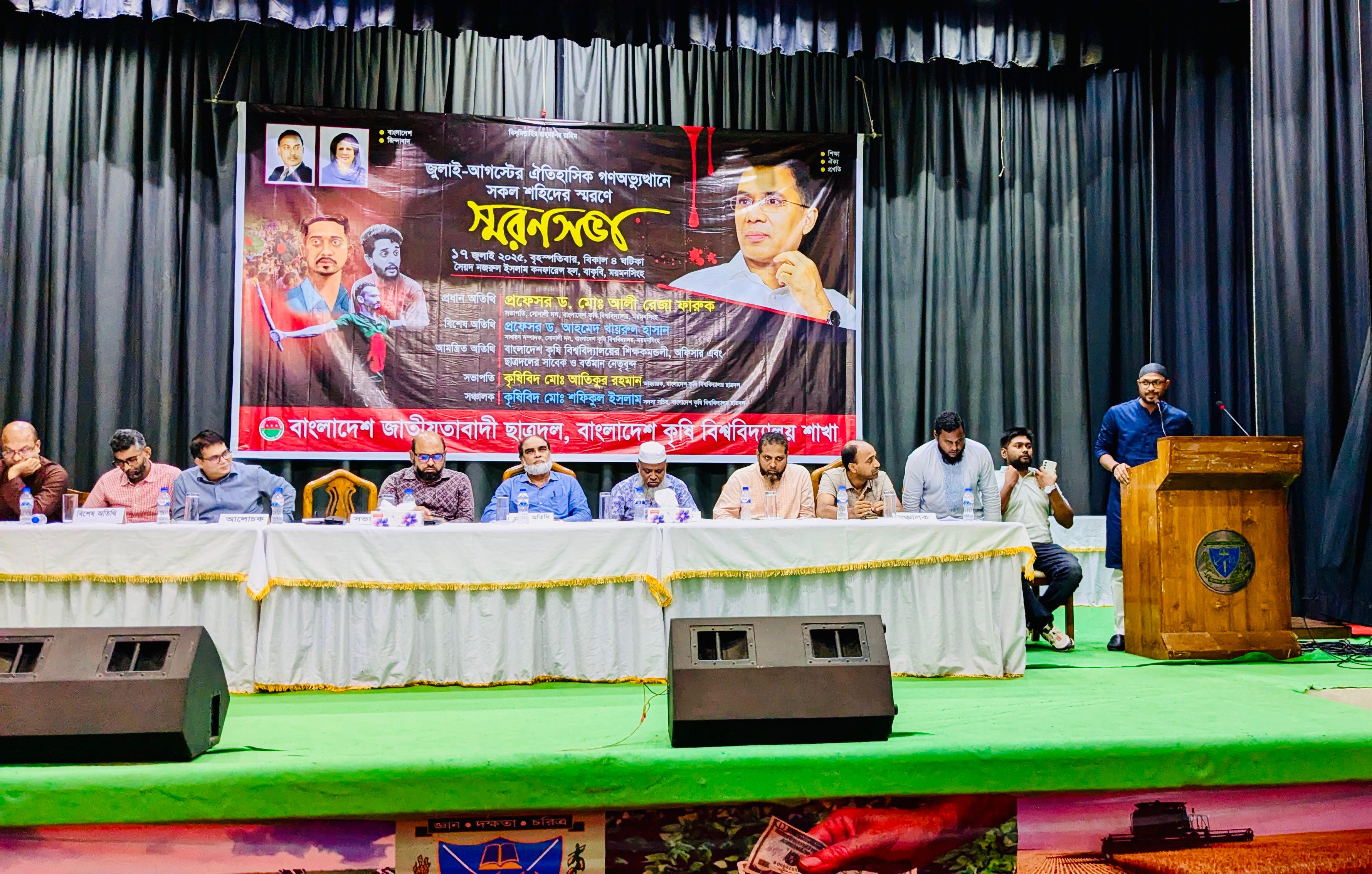 A memorial meeting was held at Bangladesh Agricultural University (BAU) in remembrance of all the martyrs of the historic July–August mass uprising. The program took place on Thursday (July 17) at 5:30 PM in the Syed Nazrul Islam Conference Hall of the university. It was organized by the BAU unit of the Bangladesh Jatiyatabadi Chhatra Dal (BNP’s student wing).
