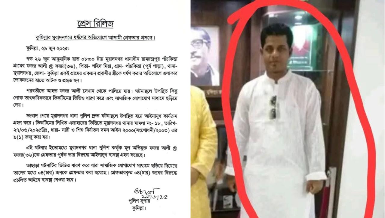 PNN ডেস্ক | কুমিল্লা | ২৯ জুন ২০২৫: কুমিল্লার মুরাদনগর উপজেলায় সংঘটিত ধর্ষণ মামলার প্রধান আসামি ফজর আলী ও ভিডিও ছড়িয়ে দেওয়া ঘটনায় জড়িত আরও চারজনকে গ্রেফতার করেছে পুলিশ। গত ২৬ জুন রাত ৮টার দিকে উপজেলার রামচন্দ্রপুর পঞ্চকিপ্তা গ্রামের ফজর আলী ওরফে ফজল (৩৬) একই এলাকার এক প্রবাসীর স্ত্রীকে ধর্ষণ করে বলে অভিযোগ ওঠে।
