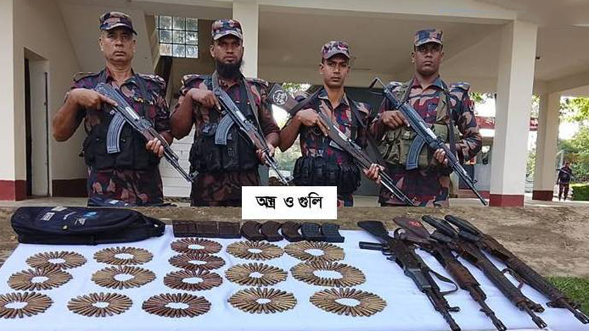 বিজিবি জানায়, গোপন সংবাদের ভিত্তিতে নদীপথে টহল চালানোর সময় কয়েকজন সন্দেহভাজনকে লক্ষ্য করা যায়। বিজিবি সদস্যদের উপস্থিতি টের পেয়ে তারা কয়েক রাউন্ড গুলি ছুড়ে দ্রুত মিয়ানমারের দিকে পালিয়ে যায়। পরে ঘটনাস্থলে তল্লাশি চালিয়ে লুকানো অবস্থায় তিনটি আধুনিক রাইফেল, একটি বিদেশি অস্ত্র, আটটি ম্যাগাজিন এবং ৫০০ রাউন্ডের বেশি গুলি উদ্ধার করা হয়।