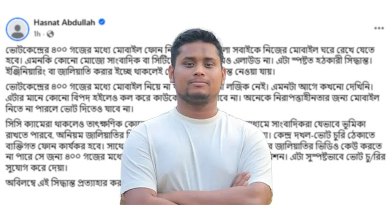 In a statement posted on his verified Facebook page at 11:25 a.m. on Monday, Hasnat Abdullah said banning mobile phones near polling centers means voters would have to leave their phones at home, completely shutting down mobile journalism and citizen reporting. According to him, such decisions are taken when there is fear of election manipulation.