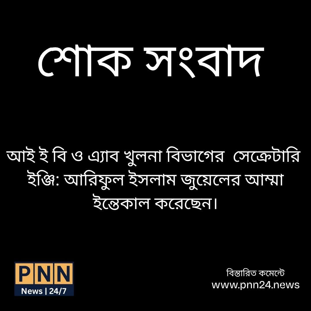 খুলনা আই ই বি (ইনস্টিটিউশন অব ইঞ্জিনিয়ার্স, বাংলাদেশ) ও অ্যাব খুলনা বিভাগের সম্মানিত সেক্রেটারি ইঞ্জিনিয়ার আরিফুল ইসলাম জুয়েল-এর মা আজ কিছুক্ষণ আগে ইন্তেকাল করেছেন (ইন্নালিল্লাহি ওয়া ইন্না ইলাইহি রাজিউন)।