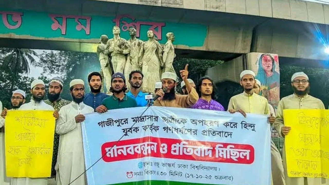 গাজীপুরে এক মাদ্রাসা ছাত্রীকে অপহরণের পর নৃশংসভাবে গণধর্ষণের ঘটনার প্রতিবাদে ঢাকা বিশ্ববিদ্যালয়ে (ঢাবি) মানববন্ধন ও প্রতিবাদ মিছিল করেছে খেলাফত ছাত্র মজলিস।