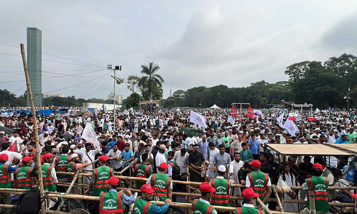 At 2:00 p.m., the main segment of the rally began with a recitation from the Quran. Earlier, at around 12:15 p.m., Jamaat's Ameer Dr. Shafiqur Rahman entered the venue, welcomed with enthusiastic chants from supporters lining the streets.