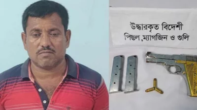মেহেরপুরের গাংনী উপজেলায় এক বিদেশি পিস্তল, তিন রাউন্ড গুলি ও দুইটি ম্যাগাজিনসহ গোলাম মোস্তফা ডাকু (৫০)কে আটক করেছে যৌথবাহিনী। সোমবার (৩১ আগস্ট) বিকেল সাড়ে চারটায় র্যাব ও সেনাবাহিনীর যৌথ দল গাংনী পৌরসভার চৌগাছা গ্রামের ভিটাপাড়ায় অভিযান চালিয়ে তাকে গ্রেপ্তার করে।