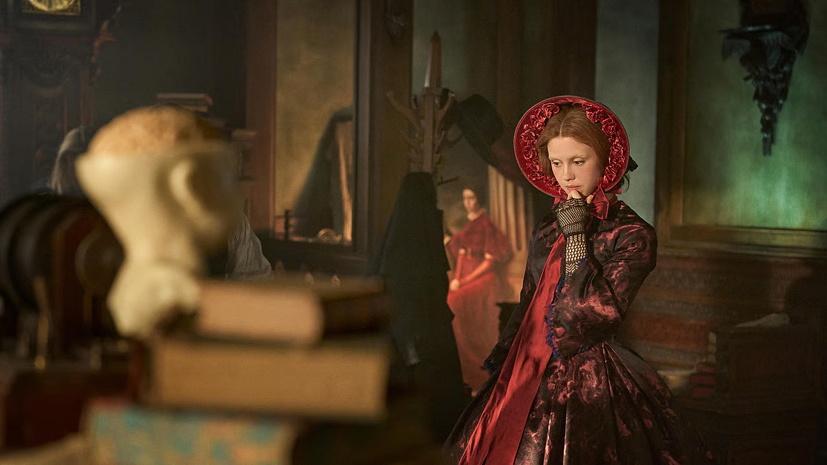 Mia’s performance has received praise, and her costume has also caught the eye of both audiences and critics. In her first appearance as Victor’s brother William’s fiancée, Mia appears in a shimmering blue-green outfit, creating a striking contrast with the Victorian gray world of the film. Her crown-like headpiece and a special necklace by Tiffany & Co. reflect inspiration from ancient Egyptian designs.