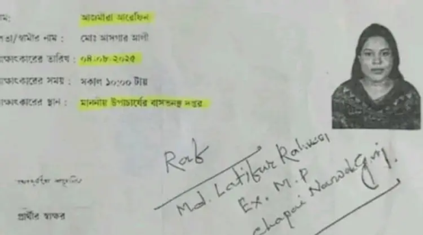 শনিবার রাতে বিশ্ববিদ্যালয়ের উপ-উপাচার্য (শিক্ষা) অধ্যাপক ফরিদ উদ্দিন খানের ফেসবুক স্টোরিতে আজমীরা আরেফিন নামে এক প্রার্থীর প্রবেশপত্রের ছবি আপলোড হলে ঘটনাটি সামনে আসে। প্রবেশপত্রে সুপারিশকারী হিসেবে ইংরেজিতে স্পষ্টভাবে লেখা রয়েছে: “Referred by Former MP Latifur Rahman, Chapainawabganj-3.”