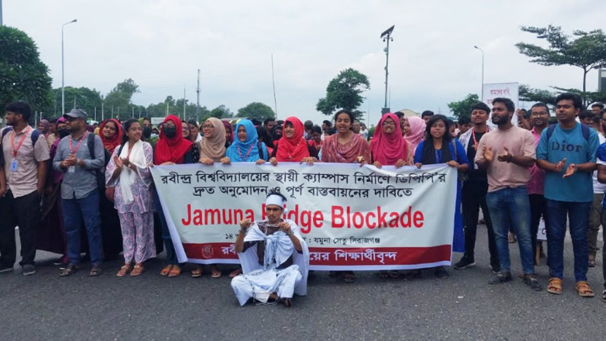 সিরাজগঞ্জে স্থায়ী ক্যাম্পাস প্রতিষ্ঠার দাবিতে যমুনা সেতুর টোল প্লাজা সংযোগস্থল অবরোধ করে আন্দোলনে নেমেছেন রবীন্দ্র বিশ্ববিদ্যালয়ের শিক্ষার্থীরা। বৃহস্পতিবার সকাল ১১টা ৫০ মিনিটের দিকে তারা সড়কে ব্যারিকেড দিলে দেশের অন্যতম ব্যস্ত সেতুটির ওপর দিয়ে যান চলাচল বন্ধ হয়ে যায়।