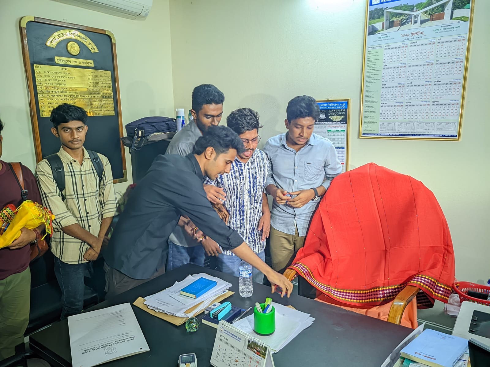 Eyewitnesses reported that a group of students gathered at the south gate of the university administrative building in the afternoon, chanting slogans against manipulative student politics. Later, they entered the proctor’s and student advisory offices carrying sarees and bangles, which they placed on chairs and tables before leaving. The officials were not present at the time.